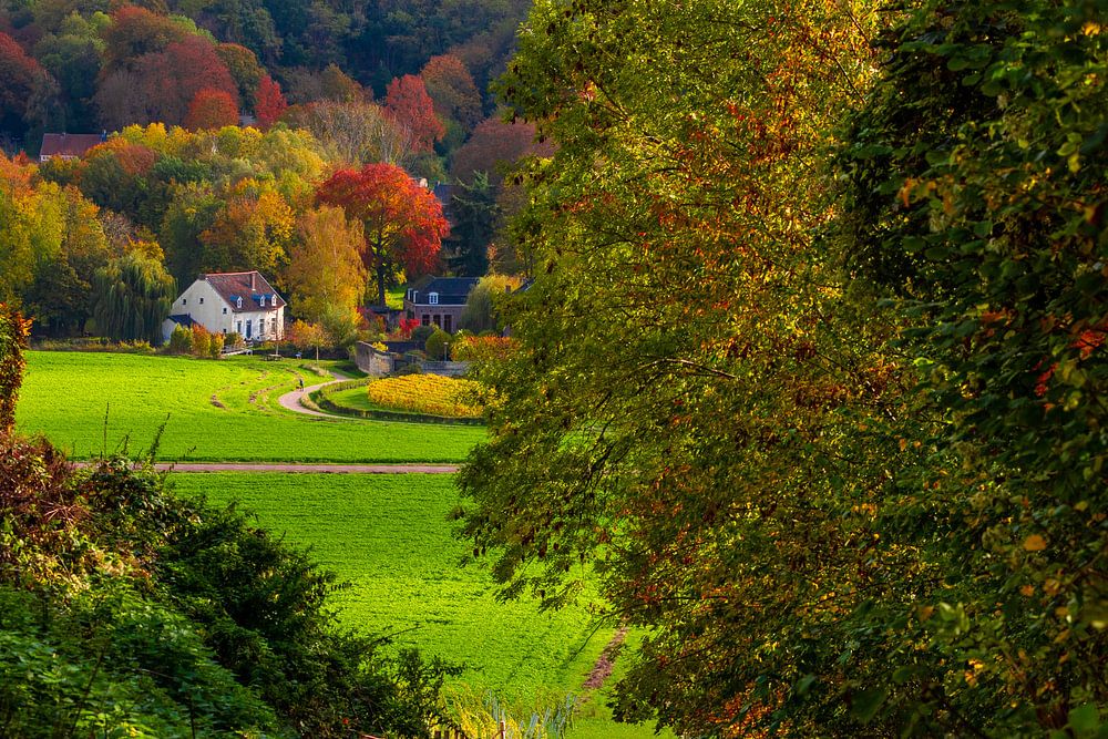 Warme Herbstfarben in Maastricht mit Blick durch die Weinreben des apostelhoeve, auf das Jeker-Tal, die Herbstfarben des Sint Pietersbergs und mit einem dramatischen Himmelsfest mit bedrohlichen Wolken. Das Foto vermittelt eine Atmosphäre, als wäre man im tiefen Süden von Frankijk.