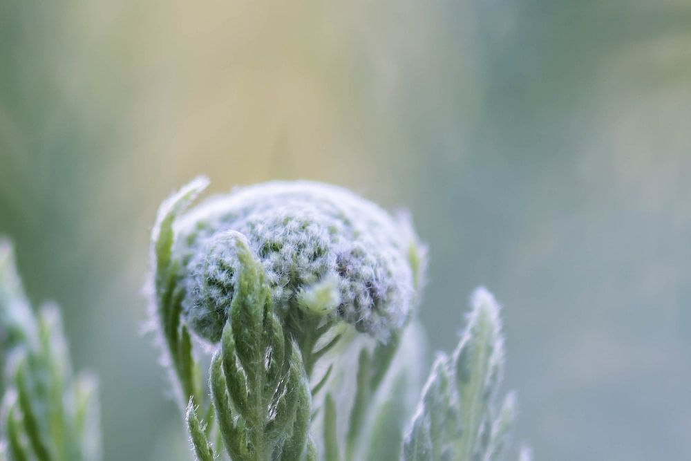 Nahaufnahme eines knospenden Frühlingsblühers, mit weichem weiß-grünem Hintergrund