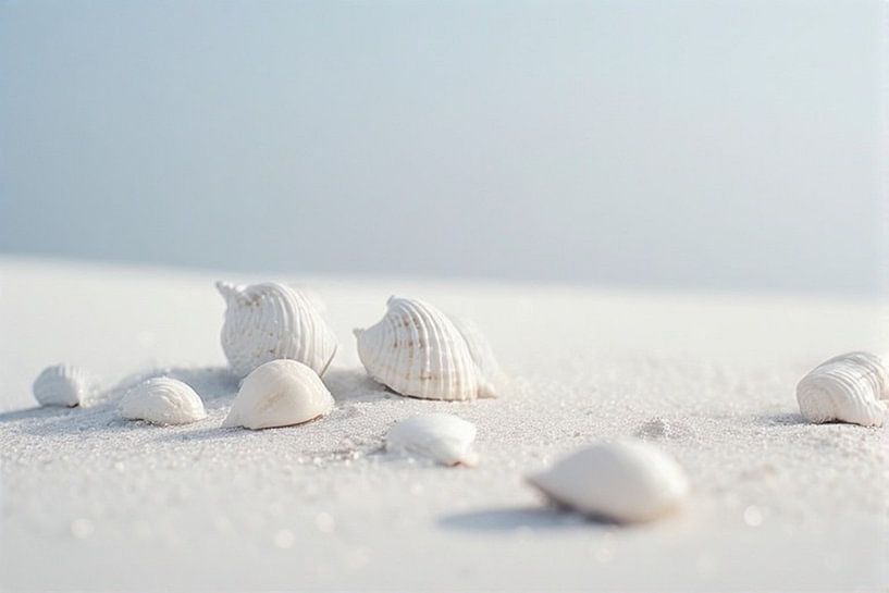 einige weiße Muscheln am Strand im Sand, mit dem hellblauen Meer im Hintergrund.