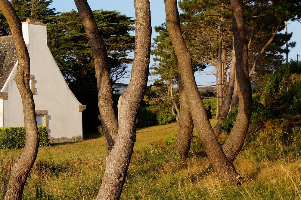 weißes Haus im Abendlicht zwischen Baumkränzen