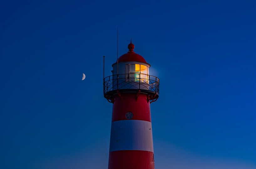 Ein Leuchtturm steht in der blauen Stunde am Meer. Der Himmel ist dunkelblau und ruhig. Hinter dem Turm kann man den runden Mond sehen, der ein sanftes Licht spendet.