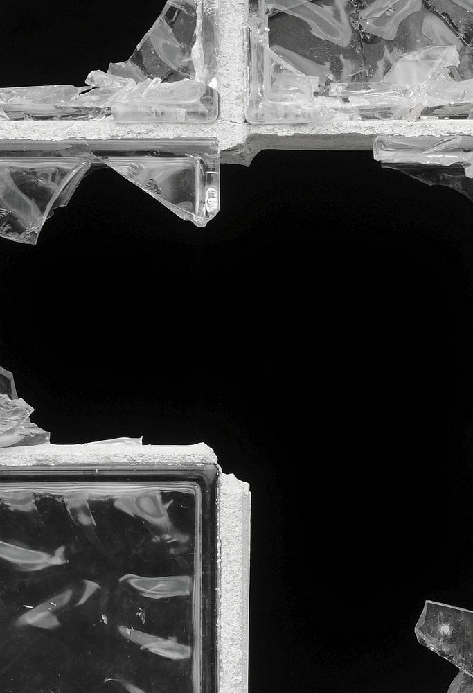 zerstörtes Fenster aus Glasbausteinen an einer Fassade einer stillgelegten Fabrik in Magdeburg in Deutschland