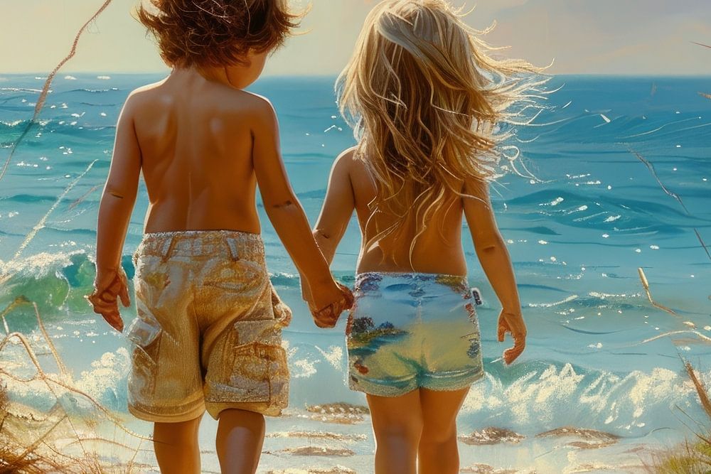 Sommerszene von hinten mit zwei Kindern am Strand in der Brandung, die zum Horizont blicken. ai künstliche Intelligenz, computergeneriertes Bild