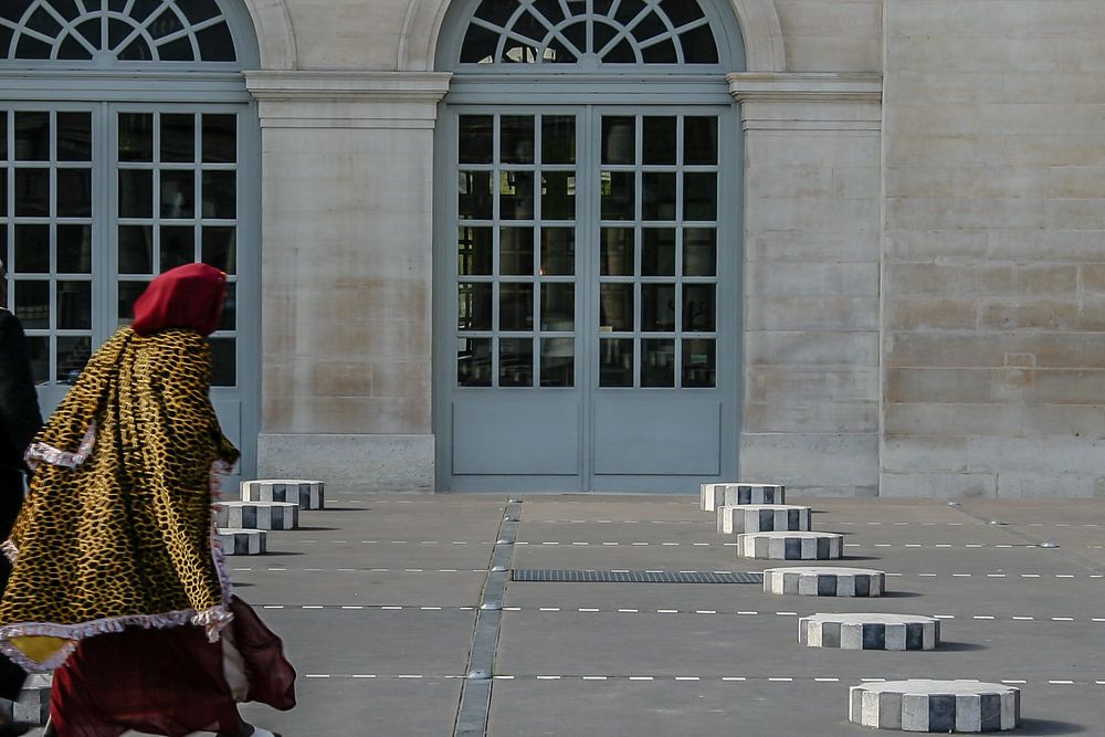 zwei wunderschön gekleidete Frauen in einem Hof in Paris