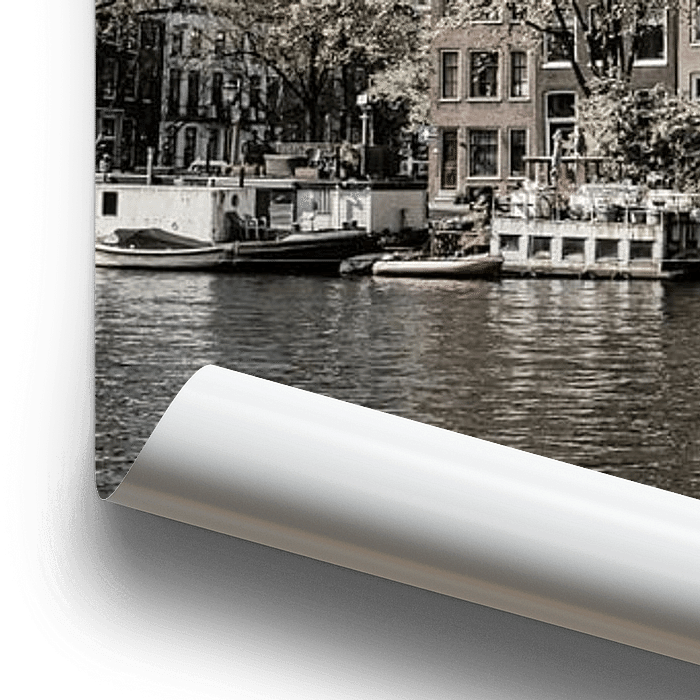Bestelle das Foto Aan de Amstel schwarz und weiß, Amsterdam von Rietje Bulthuis als Reproduktion auf Leinwand, Alu-Dibond, als Poster, Fototapete oder Acrylglasbild.