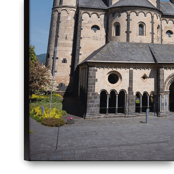Bestelle das Foto Abtei Maria Laach in Deutschland an einem sonnigen Tag mit blauem Himmel von ChrisWillemsen als Reproduktion auf Leinwand, Alu-Dibond, als Poster, Fototapete oder Acrylglasbild.