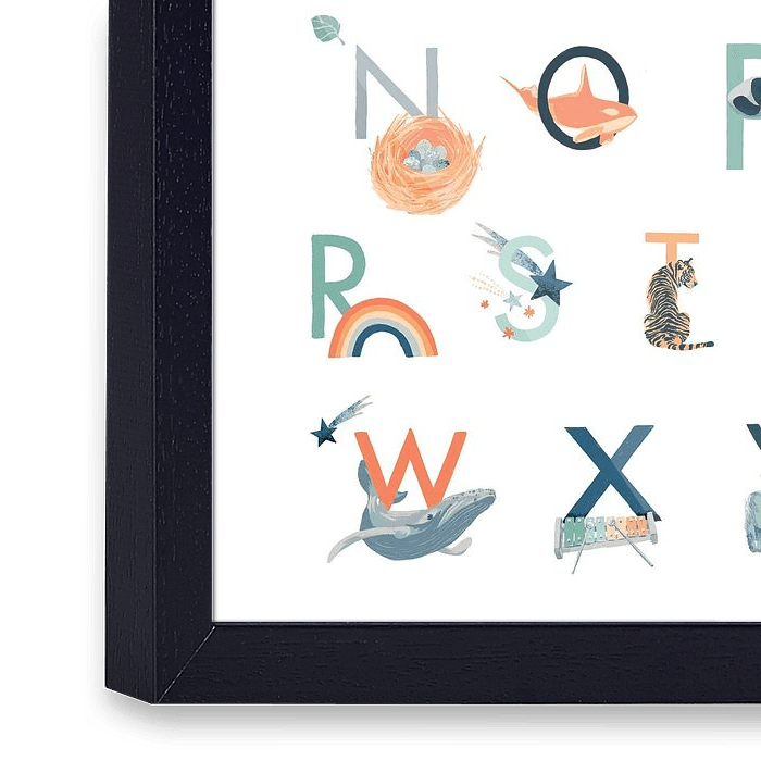 Poster mit allen Buchstaben des Alphabets, in fröhlichen Pastellfarben und mit schönen Illustrationen.