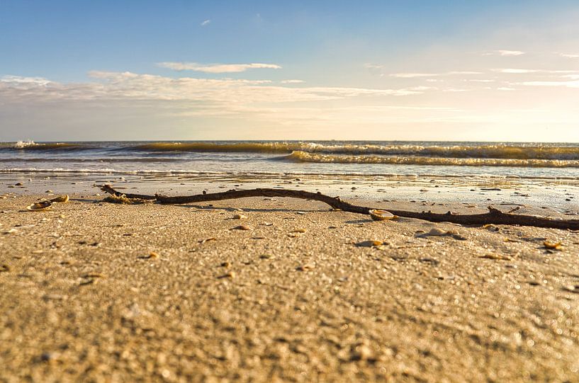 Am Strand von Blåvand im Sonnenschein am Meer. Ast im Vordergrund