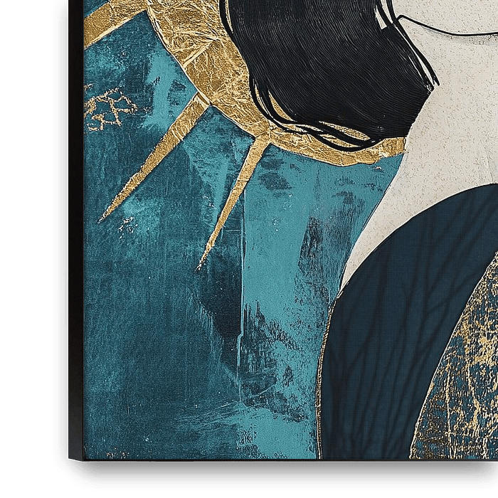 Ein Art-Deco-Gemälde einer androgynen Figur mit kurzen schwarzen Haaren, goldenem Make-up, geschlossenen Augen und einem blauen Kleid mit goldenen Sonnenstrahlen um den Kopf, vor einem tealfarbenen Hintergrund. Gouache-Illustration mit einem strukturierten Druck.
