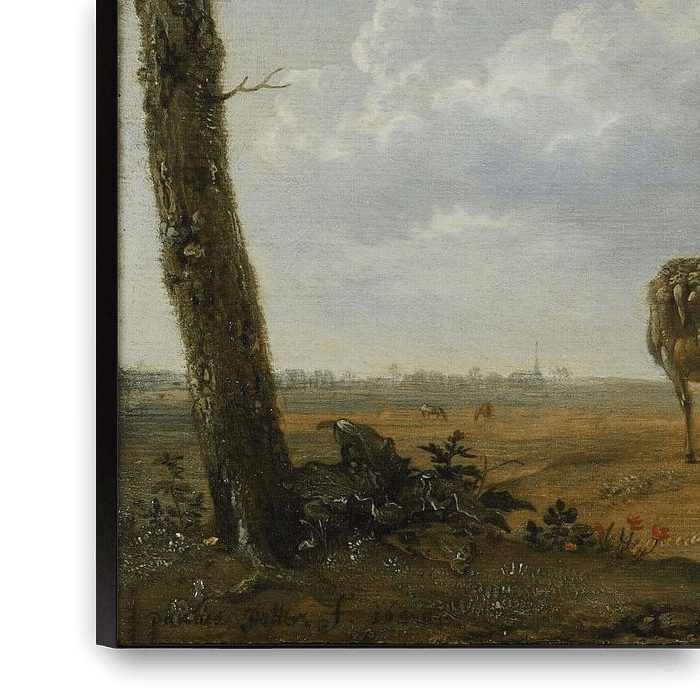 In den 1640er Jahren wurden Viehstücke zu einer beliebten Gattung, insbesondere bei den Städtern. Dies ist vor allem auf Karel van Manders Übersetzung von Vergil zurückzuführen, die 1597 veröffentlicht wurde. Die Gattung erreichte ihren Höhepunkt in den Werken von Paulus Potter. Um die Bedeutung des Viehs zu verstärken, zeigt der Maler es hier von einem niedrigen Standpunkt aus mit dem weiten niederländischen Himmel darüber. Die Viehzucht war eine der Säulen des Reichtums der Niederlande.