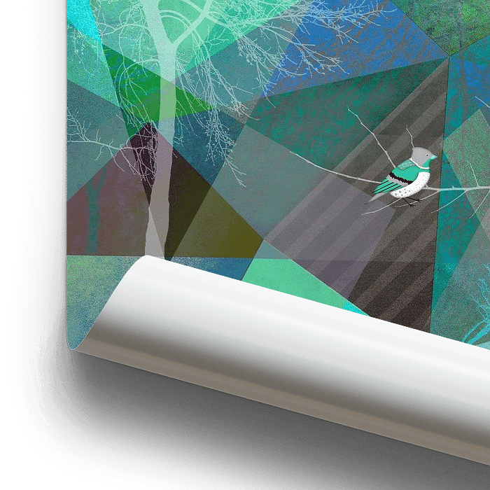 Portrait Version. From my concept work: Polygons and More: 3 little birds singing into a graphical fantasy landscape, consisting of geometric shapes and tree silhouettes. ©2016 by Pia Schneider | atelier COLOUR-VISION.