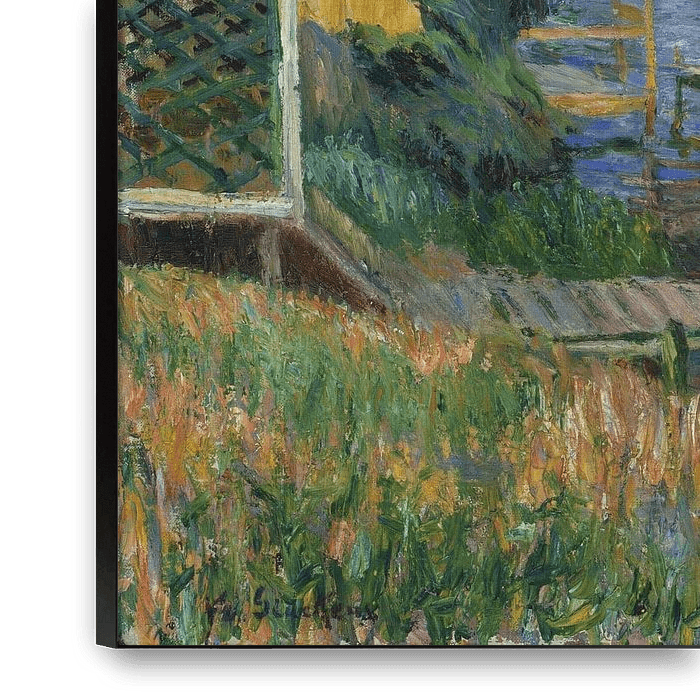 Glackens verbrachte die Sommer zwischen 1911 und 1916 in Bellport, Long Island, einer ruhigen, unberührten Gemeinde, die Künstler, Schriftsteller und Musiker anzog. Dort malte er eine Reihe von Strandszenen - lebendige Gemälde, die sich von seinen düsteren und trostlosen Werken früherer Jahre abheben. Während der Sommer in Bellport malte Glackens zahlreiche Werke an der Great South Bay, die seine Familie und Freunde bei sommerlichen Vergnügungen zeigten - Sonne und Strand, Segeln und Schwimmen. In Bathers at Bellport begrenzen horizontale Docks und Sandbänke das glitzernde blaue Wasser; leuchtend gelbe ocker- und sienafarbene Badehäuser kontrastieren mit strahlend weißen Segeln. Dieses Werk ist eine visuelle Erinnerung an den Sommer 1912 und zeigt Glackens' wachsendes Interesse am Impressionismus und sein Verständnis für den bedeutenden Einfluss der französischen Kunst auf die amerikanische Kunst. Die Klarheit der von der Natur abgeleiteten Farben, die für den französischen Impressionismus so charakteristisch ist, hat Glackens offensichtlich sehr beeindruckt. Bathers at Bellport erinnert in der breiten und direkten Behandlung der Farbe, der Kürze des Strichs und der Spritzer juwelenartiger Pigmente, die das Blattwerk und die schimmernde Reflexion der Sonne auf dem Wasser darstellen, an die Gemälde von Claude Monet aus den 1860er Jahren.