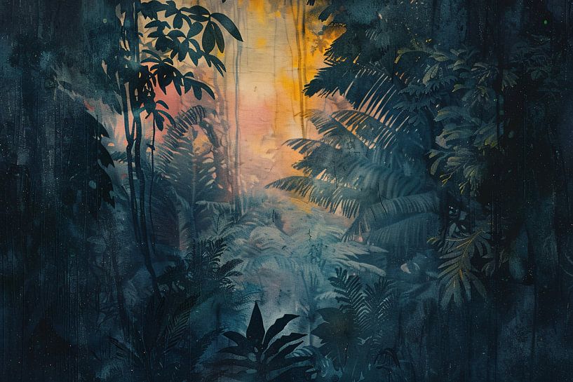 Dieses Gemälde fängt die heitere Atmosphäre eines tropischen Regenwaldes bei Sonnenaufgang ein. Das Licht, das durch die Blätter strahlt, erzeugt ein bezauberndes Leuchten, während der umgebende Nebel ein Gefühl des Geheimnisvollen hervorruft. Dieses Kunstwerk kombiniert tiefe Blautöne mit warmen Gelb- und Orangetönen, die zusammen ein…