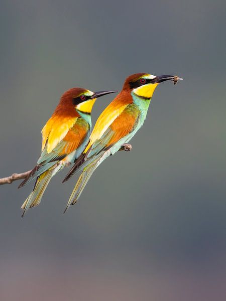 Ein Pärchen der wunderschönen und bunten Bienenfresser sitzt auf einem Zweig. Die Sommersonne läßt das Gefieder herrlich bunt schillern.