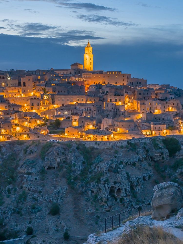 Diese Aufnahme der faszinierenden Höhlenstadt Matera entstand kurz nach dem Sonnenuntergang zur Blauen Stunde in einer Langzeitbelichtung.
