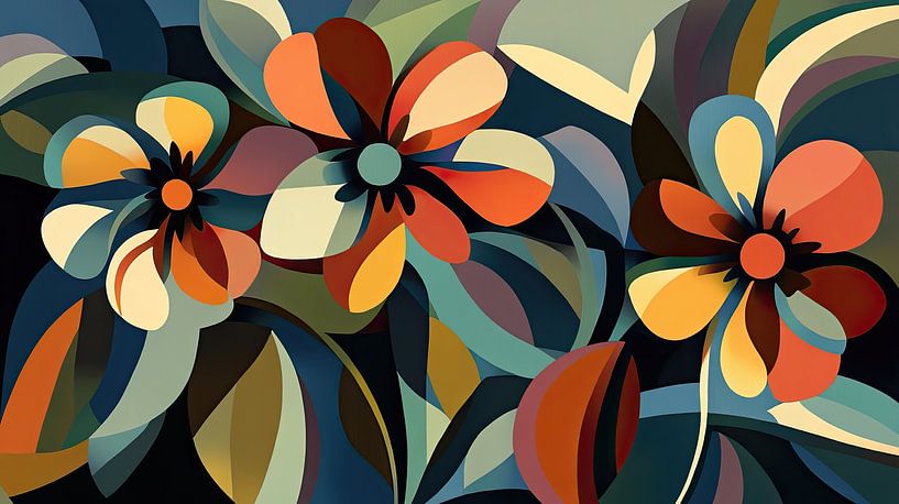Das Gemälde zeigt eine lebendige, fließende Komposition abstrakter Blumenformen in leuchtenden Farben, die ineinander übergehen und den Eindruck von Bewegung und Tiefe erzeugen. Sanfte und kräftige Farbtöne verschmelzen zu einem harmonischen Spiel der Natur, das die Fantasie anregt.