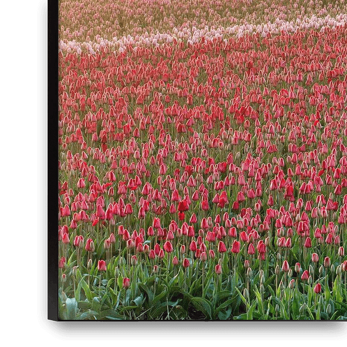 Bestelle dieses Landschafts-Wandbild Blühende Tulpenfelder im Morgennebel von Frans Lemmens als Reproduktion auf Leinwand, Alu-Dibond, als Poster, Fototapete oder Acrylglasbild.