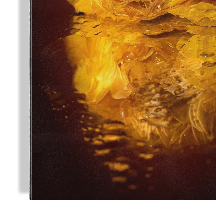 Eine zarte Ranunkel, eingefangen in einem Moment intensiver Schönheit. Die warmen Orange- und Goldtöne spiegeln sich im stillen Wasser wider, wo Realität und Spiegelung miteinander verschmelzen. Eine Hommage an vergängliche Schönheit und das Licht, das Blumen trägt.