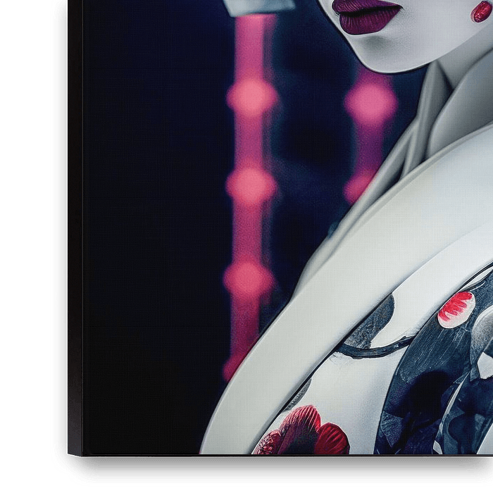 Dieses Kunstwerk strahlt eine intensive Mischung aus Tradition und futuristischer Ästhetik aus. Im Zentrum steht eine Frau, deren weißes Gesicht an die klassische Geisha-Kultur erinnert, doch ihre Erscheinung ist durch moderne und mechanische Elemente angereichert. Ihr Haar ist streng hochgesteckt und von schwarzen, metallisch wirkenden…