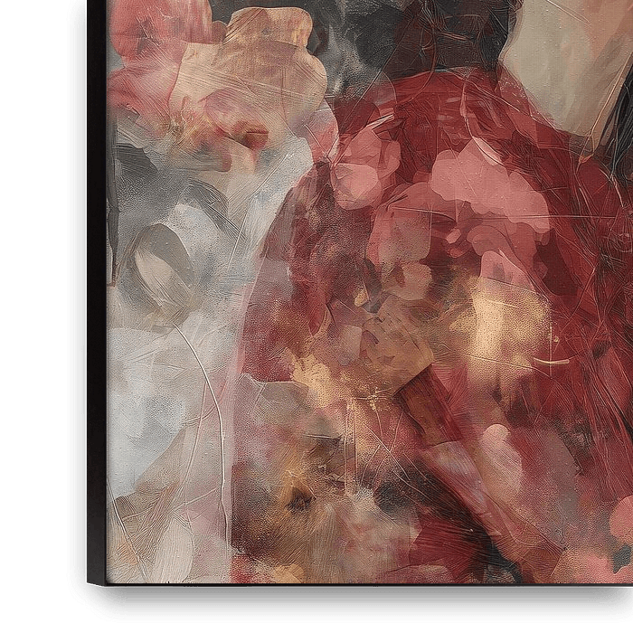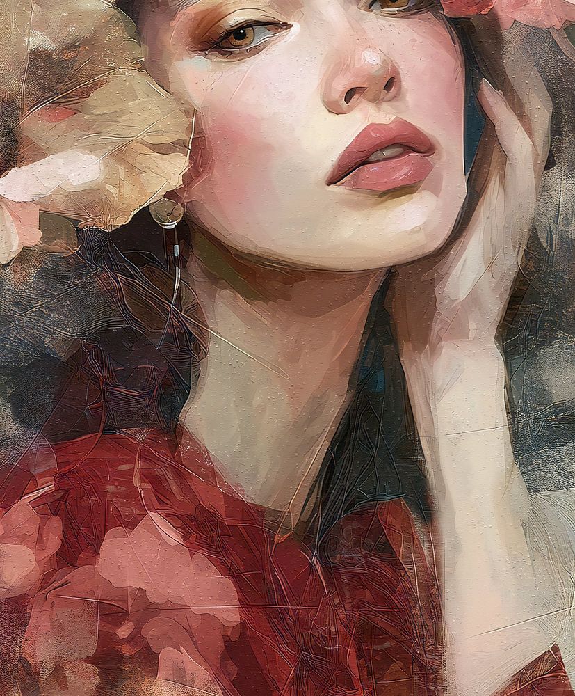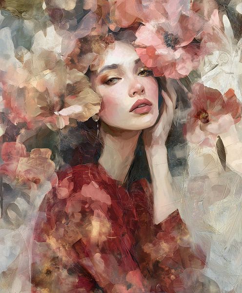 Porträt einer schönen Frau in einer roten Bluse mit zarten Gesichtszügen, roten Lippen und geheimnisvollen Augen. Sie ist umgeben von Blumen, gemalt mit sichtbaren Pinselstrichen und Textur, vor einem hellbraunen Hintergrund mit weicher Beleuchtung und warmen Tönen.