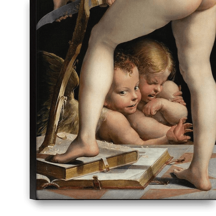 Bestelle Bogenschnitzerei Amor, Parmigianino als Reproduktion auf Leinwand, Alu-Dibond, als Poster, Fototapete oder Acrylglasbild.