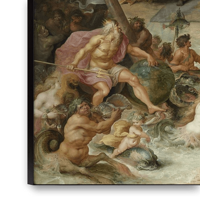 Allegorie über die Abdankung Kaiser Karls V. in Brüssel. In der Mitte sitzt Charles V auf seinem Thron, flankiert von seinen Nachfolgern Ferdinand I und Philip II. Für Philip knien die Personifikationen der Territorien des Imperiums mit ihren Fahnen nieder. Im Vordergrund bieten die Personifikationen der Kontinente, Amerikas, Afrikas, Europas und Asiens Geschenke. Links reitet Neptunus auf seiner von Trittbrettern mit Seepferdchen gezogenen Kutsche, begleitet von Meerjungfrauen, Meerjungfrauen, Tritonen usw. Am Wagen eine Kugel und zwei Säulen mit Banderole mit Plus Ultra.