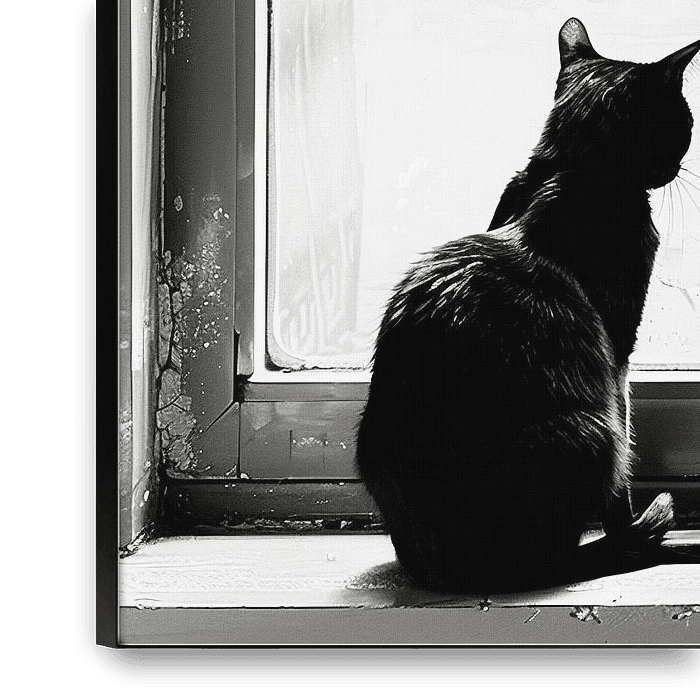 Ein Schwarz-Weiß-Bild zeigt eine elegante schwarze Katze, die vor einem Fenster sitzt, wobei ihre Präsenz durch den Kontrast zwischen Dunkelheit und Licht verstärkt wird. Ihr Fell, so tief wie die Nacht selbst, fängt das wenige Licht ein, das durch das Fenster fällt, und erzeugt subtile Schatten und Schimmer, die ihre mystische Aura…