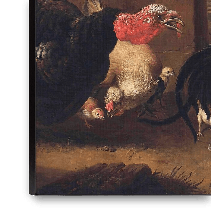 Bestelle Ein Hahn, ein Truthahn und andere Vögel in einer Landschaft, Melchior de Hondecoeter als Reproduktion auf Leinwand, Alu-Dibond, als Poster, Fototapete oder Acrylglasbild.