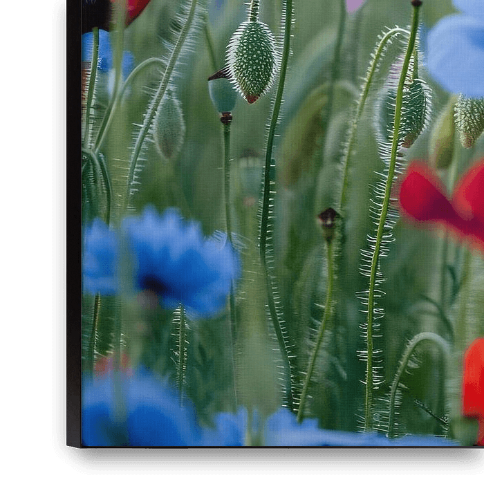 Bestelle das digitale Kunst Bild Ein leuchtendes Feld mit Mohn- und Kornblumen von Art & Soul Creations als Reproduktion auf Leinwand, Alu-Dibond, als Poster, Fototapete oder Acrylglasbild.