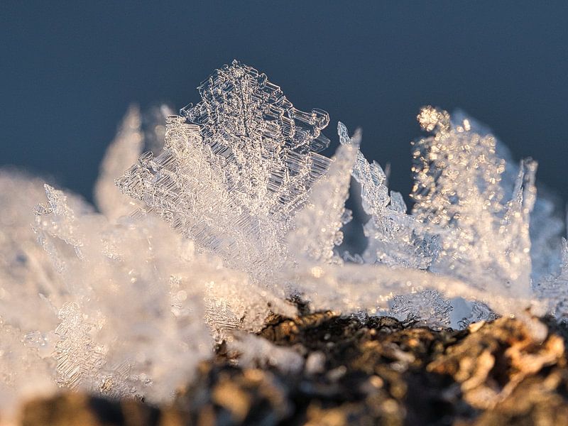 Bestelle dieses Landschafts-Wandbild Eiskristalle, die sich an einem Baumstamm gebildet haben und in die Höhe gewachsen sind. von Martin Köbsch als Reproduktion auf Leinwand, Alu-Dibond, als Poster, Fototapete oder Acrylglasbild.