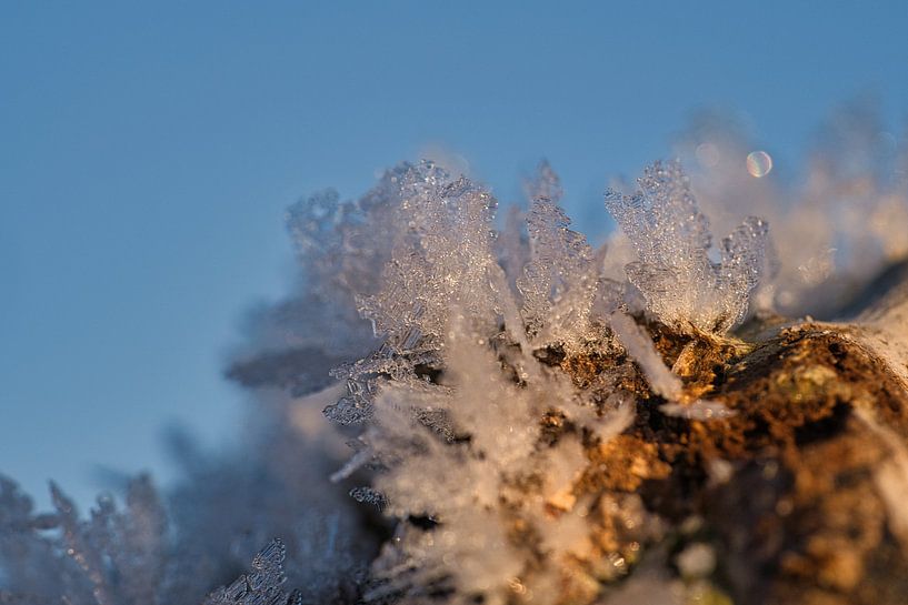 Bestelle dieses Landschafts-Wandbild Eiskristalle, die sich an einem Baumstamm gebildet haben und in die Höhe gewachsen sind. von Martin Köbsch als Reproduktion auf Leinwand, Alu-Dibond, als Poster, Fototapete oder Acrylglasbild.