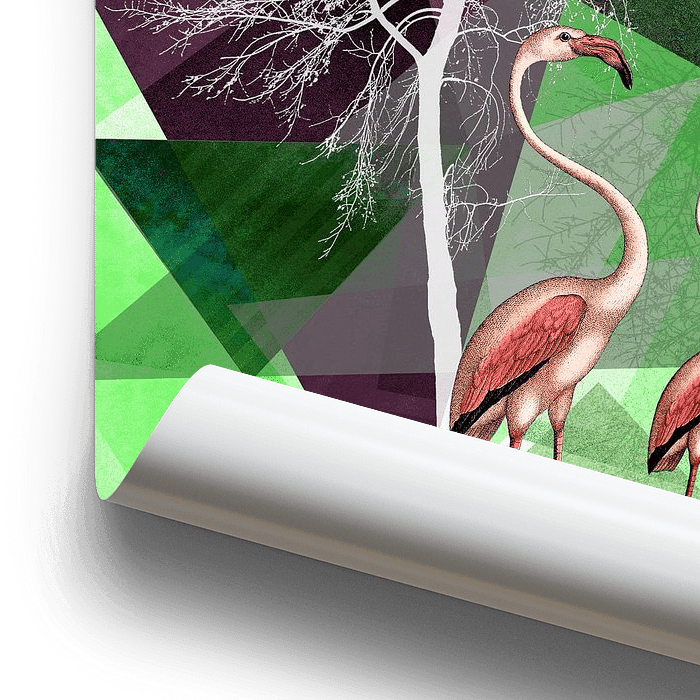 Aus meiner aktuellen Konzept-Arbeit: "Polygons & More". 2 Flamingos erwandern eine grafische Fantasielandschaft, bestehend aus geometrischen Formen und Baum Silhouetten.