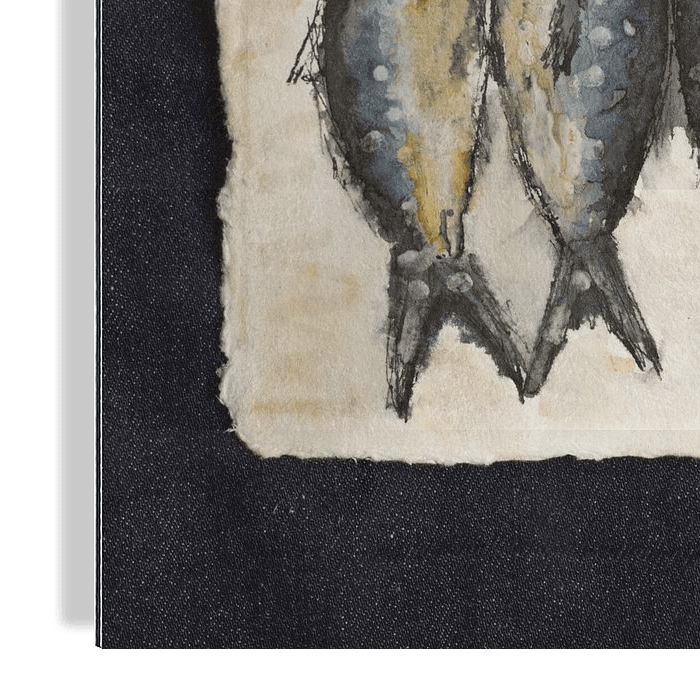 Dieses charmante Aquarell zeigt drei frische Fische in wunderbar natürlichen Farben. Der weiche Übergang von Blau zu Silber mit warmen orangefarbenen Akzenten macht dieses Werk perfekt für jeden Raum, in dem das Essen im Mittelpunkt steht.