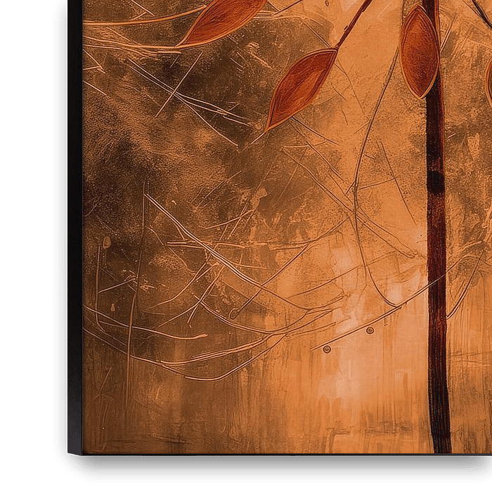 Das Kunstwerk ist ein abstraktes, botanisch inspiriertes Bild einer Pusteblume, das von einer warmen, monochromen Palette aus Orange-, Braun- und tiefen Sepiatönen dominiert wird.