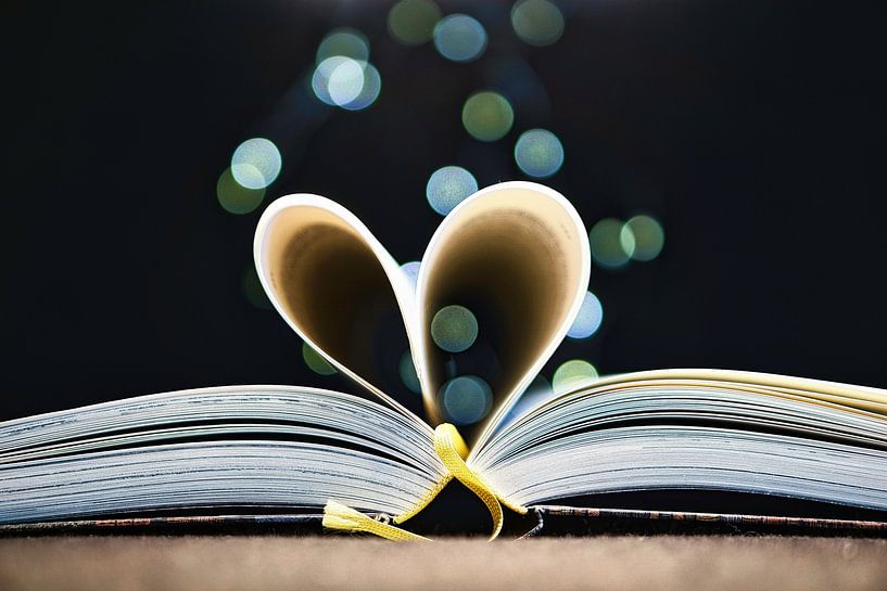Bestelle das Foto Herzseiten in einem Buch mit Lichtpunkten von Martin Köbsch als Reproduktion auf Leinwand, Alu-Dibond, als Poster, Fototapete oder Acrylglasbild.