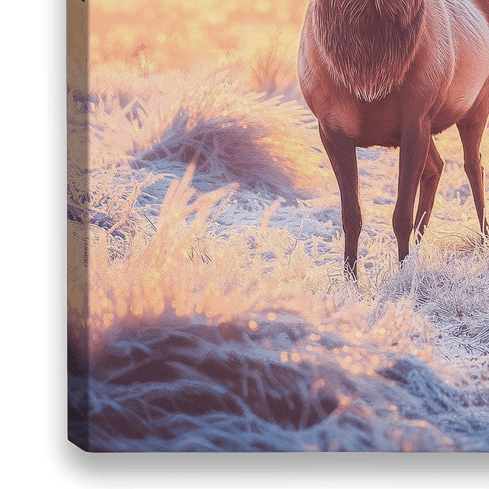 Im zarten Licht der Morgendämmerung steht ein majestätischer Hirsch stolz im frostigen Gras. Seine imposanten, verzweigten Geweihstangen glänzen wie winterliche Kronen, während der goldene Sonnenaufgang den frostigen Boden in ein funkelndes Meer verwandelt. Eine Szene von ergreifender Stille, die den Atem der Natur einfängt.