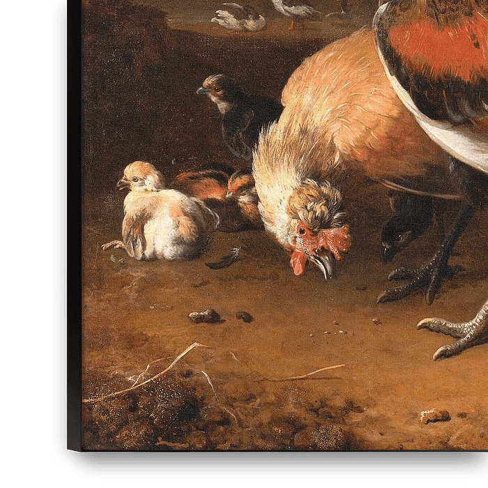 Hoenderhof mit einem Hahn, umgeben von einigen Hühnern und Küken. Auf der rechten Seite ist eine Taube auf einem Stein. Links im Hintergrund ein Teich mit Enten.
