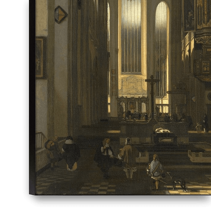 De Witte malte mehrere stimmungsvolle Kircheninterieurs, die alle imaginär sind. Hier zeigt er eine gotische Kirche mit hohen, schmalen Spitzbögen. Das Licht fällt auf einige Figuren im Vordergrund, während der Rest der Kirche in Dunkelheit gehüllt ist.