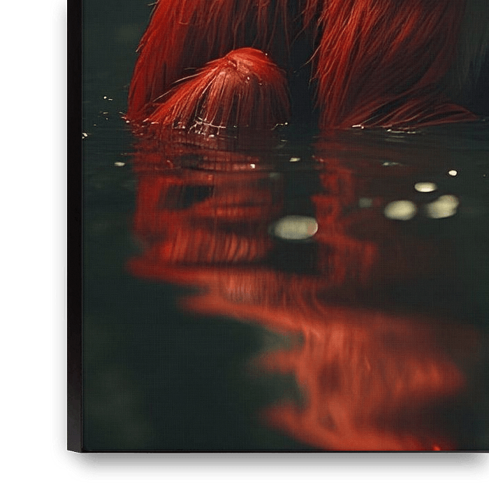 Ein auffallendes und surreales Bild, das zwei Affen mit leuchtend rotem Fell zeigt, die sich gegenüberstehen, während sie teilweise in dunkles Wasser eingetaucht sind. Das intensive Rot ihres Fells steht in dramatischem Kontrast zu den gedämpften, nebligen Grüntönen des dichten Dschungelhintergrunds. Ihr Blick ist direkt und intim, was…