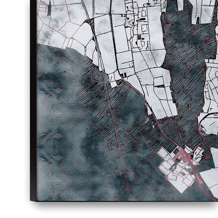 Diese Karte von Hildesheim trägt unseren maßgeschneiderten Stil „White Winter“. Die dunkelroten Straßen ziehen sich wie eine warme Arterie durch die kalte Winterlandschaft. Ein dicker weißer Schnee bedeckt die Felder und die Stadt, während die Vegetation ihre Blätter verloren hat und sich im Dunkeln auf den Frühling vorbereitet. Diese…