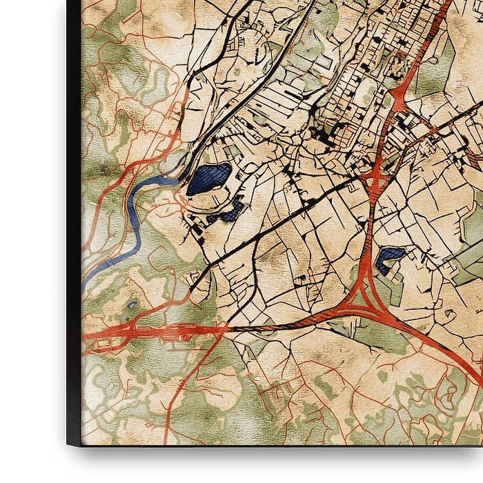 Diese Karte von Salzburg hat unseren maßgeschneiderten Stil "Serene Summer". Die Landschaft hat einen warmen, sonnenverwöhnten Erdton, während sich die roten Straßen durch die blühende Vegetation schlängeln. Diese sommerliche Farbpalette ist inspiriert von der Art Jugendstil-Bewegung zu Beginn des letzten Jahrhunderts. Diese…