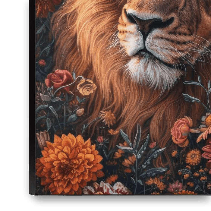 Bestelle dieses Landschafts-Wandbild Königliches Zinn - Löwe zwischen Flora von Eva Lee als Reproduktion auf Leinwand, Alu-Dibond, als Poster, Fototapete oder Acrylglasbild.