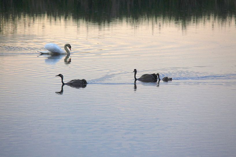 Kraniche am Abend im Sommer, schwimmend auf einem See