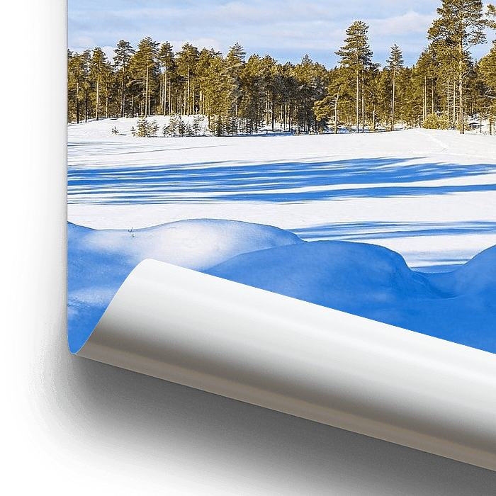 Bestelle dieses Landschafts-Wandbild Landschaft mit Schnee im Winter bei Kuusamo, Finnland von Rico Ködder als Reproduktion auf Leinwand, Alu-Dibond, als Poster, Fototapete oder Acrylglasbild.