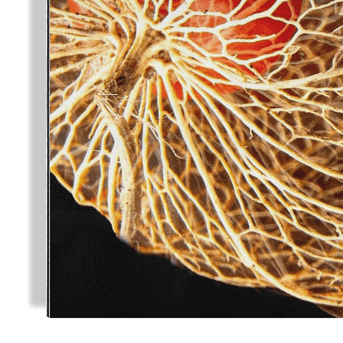 Wenn die Lampionblume (Physalis) verwest, bleibt eine Architektur aus Licht zurück. Die papierartigen Hüllen lösen sich auf und geben den Blick frei auf ein Netz von Adern und die orangefarbene Beere.