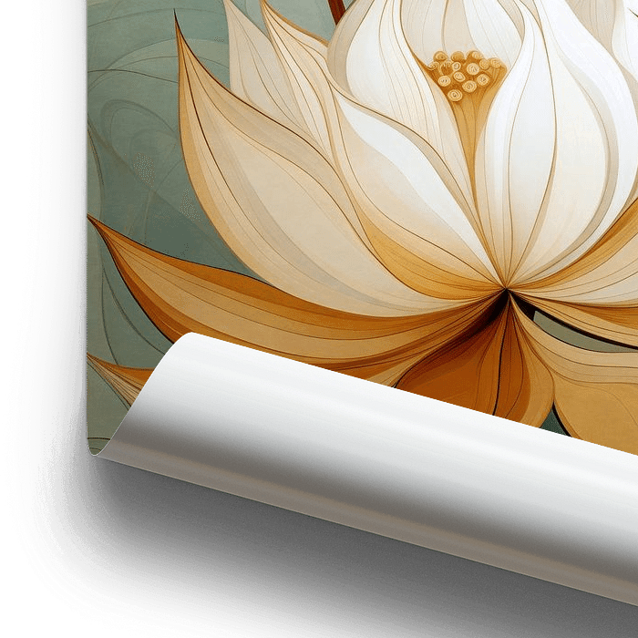 Abstrakte Illustration mit Lotusblumen in sanftem Grün, Ockergelb und Cremetönen.