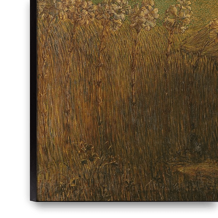 Das Werk stellt eine himmlische Vision der Madonna mit dem Jesuskind in einem Lilienfeld dar, einem traditionellen Symbol der Unschuld. Die divisionistischen Techniken erhalten neue religiöse und spirituelle Werte, die von den Präraffaeliten inspiriert sind, wie man an den lebhaften Farbflecken erkennen kann, die den Kopf der Jungfrau wie ein Heiligenschein umgeben.