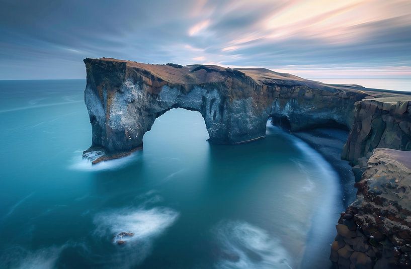 Bestelle dieses Landschafts-Wandbild Meer trifft Felsen bei Dämmerung von fernlichtsicht als Reproduktion auf Leinwand, Alu-Dibond, als Poster, Fototapete oder Acrylglasbild.
