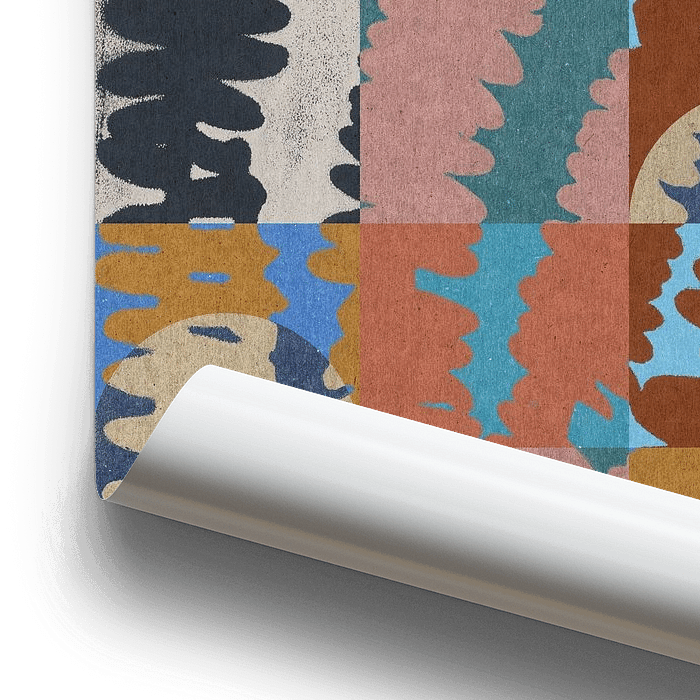 Abstrakte geometrische und organische Formen in Erdtönen, Blau, Grün und Terrakotta.