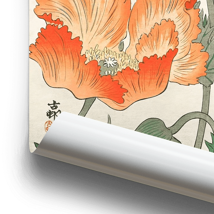 Japanische Kunst, Japan, Wabi-Sabi, asiatische Kunst, Vintage, Retro-Stil, botanisch, alte Meister, Blume, Pflanze, Natur, Mohn, Orange.